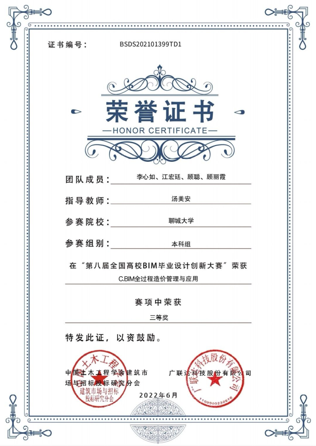恭喜91天堂 2020级优秀学生顾丽霞,在“第八届全国高校bim毕业设计创新大赛”C模块BIM全过程造价管理与应用中,荣获三等奖。