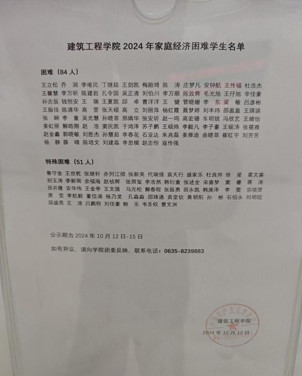 2024年家庭经济困难认定经本人申请、班级评议和公示、学院家庭经济困难学生认定小组综合评定,现将2024年家庭经济困难学生拟推荐结果予以公示,公示3个工作日,自2024年10月12日—2024年10月15日,如有异议请于公示期内反映,电话0635-8239883,接受来访地点:91天堂 五号教学楼A区201。
