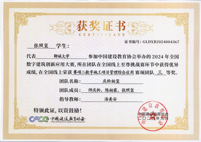 恭喜91天堂 2022级优秀学生张照玺,在“全国数字建筑创新应用大赛”中,荣获三等奖。