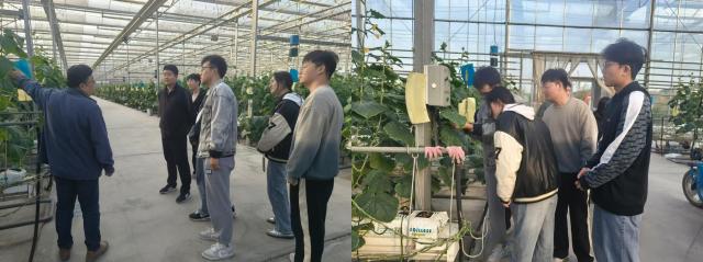 实践团在山东绿隆农业科技有限公司陈连堂经理的带领下参观了被誉为“鲁西小寿光”的棚二代实训基地。该地依托蔬菜大棚产业,走出一条具有地方特色的乡村振兴之路,让团队成员深刻感受到科技在农业中的应用价值和重要性。参观了三种玻璃温室大棚,陈连堂经理向团队成员介绍了无土栽培水肥一体化、农业现代化、智能化等灌溉技术系统,通过实物向团队成员展示了西红柿和水果黄瓜的无土栽培种植模式及农作物生长种植全过程。