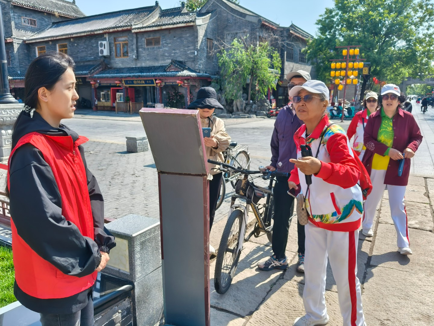 志愿者分组行动,在光岳楼各区域开展服务。志愿者按区域分工协作,全面覆盖游客服务与秩序维护工作。在动线引导区,他们针对参观路线、票务咨询等高频问题提供详尽解答,特别设置“银发帮扶岗”协助老年游客安全登楼,在转角台阶等易拥堵点实施分段引流,确保游客参观秩序顺畅。
