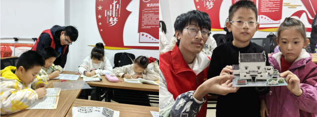 同学们带领小朋友自主选择图书阅读并组织小型读书分享会,鼓励小朋友分享阅读心得,帮助小朋友培养良好学习习惯与读书兴趣。随后,同学们根据房屋基础结构知识及模型拼装要点与安全注意事项进行生动易懂的讲解,将抽象的建筑知识转化为具象认知,充分点燃小朋友的探索热情。在模型拼装环节中,同学们全程陪伴引导,鼓励小朋友自主观察、大胆尝试,在亲手解决拼装难题的过程中,有效锻炼了空间想象力、动手操作能力与逻辑思维。最后,小朋友依次上台展示拼装成果,他们兴奋地讲解自己的拼装思路,稚嫩的话语里满是成就感。同学们纷纷表示在实践中深化了对中国传统建筑文化的理解,实现了专业知识的活学活用。