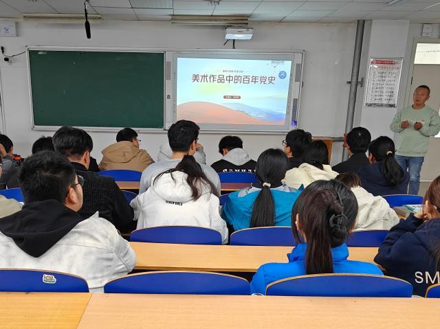 王东兵以“美术作品中的百年党史”为主题,围绕革命与建设时期、改革与新时代时期两大阶段分享党的百年奋斗历程。他结合《南昌起义》《开国大典》等经典作品与工业建设、农田开垦主题画作,带领同学们重温了中国共产党从南湖红船到建立新中国的历程,也生动展现了建国后全国人民齐心协力搞建设的实干风貌;同时借助反映城市发展与科技成就以及脱贫攻坚、科技创新、生态文明建设相关的美术作品,直观呈现了改革开放以来国家的飞速发展与新时代的发展成就,让同学们真切感受到党的百年奋斗伟力与国家发展的蓬勃生机。