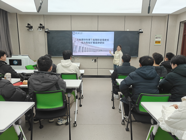 活动开始,费春鑫以冻融循环作用下裂隙砂岩强度劣化与裂纹扩展规律研究为例展开分享,她在讲解过程中将研究内容按章节细化,让各环节紧密衔接。从梳理研究内容、选定适配研究方法,到规划预期成果与进度安排,为同学们搭建课题研究框架提供了参考。她希望同学们在科研学习中要有清晰的科研逻辑与扎实的研究基础,方能稳步推进研究工作。
