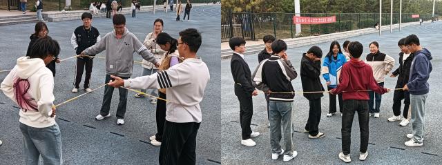 同学们首先参与“变形虫”游戏。他们被蒙上双眼,仅凭身体接触与沟通,共同协作形成一个连贯的整体。起初,面对突如其来的黑暗与未知,同学们有些茫然无措,随着时间的推移,他们逐渐学会了相互信任。每一个指令的传达、每一次身体的移动,都是默契配合的生动体现。“贴树皮”游戏将现场氛围推向了新的高潮。同学们在奔跑、追逐与躲藏中尽情释放青春的活力,仿佛回到了那段无忧无虑的童年时光,纯真的笑容在每个人的脸上绽放。