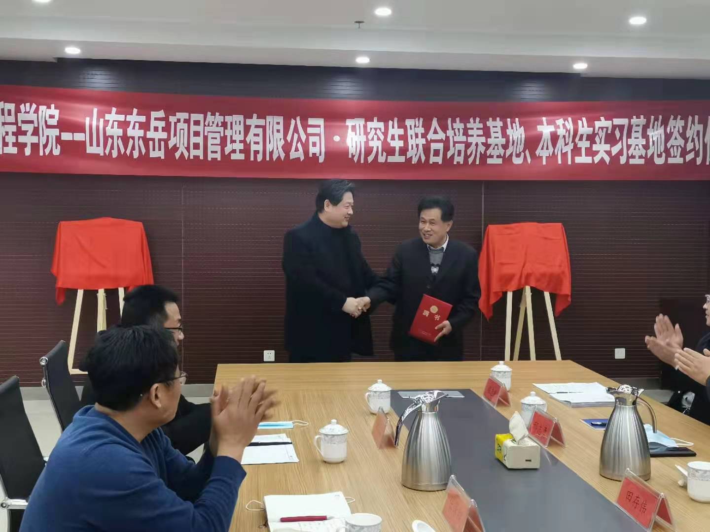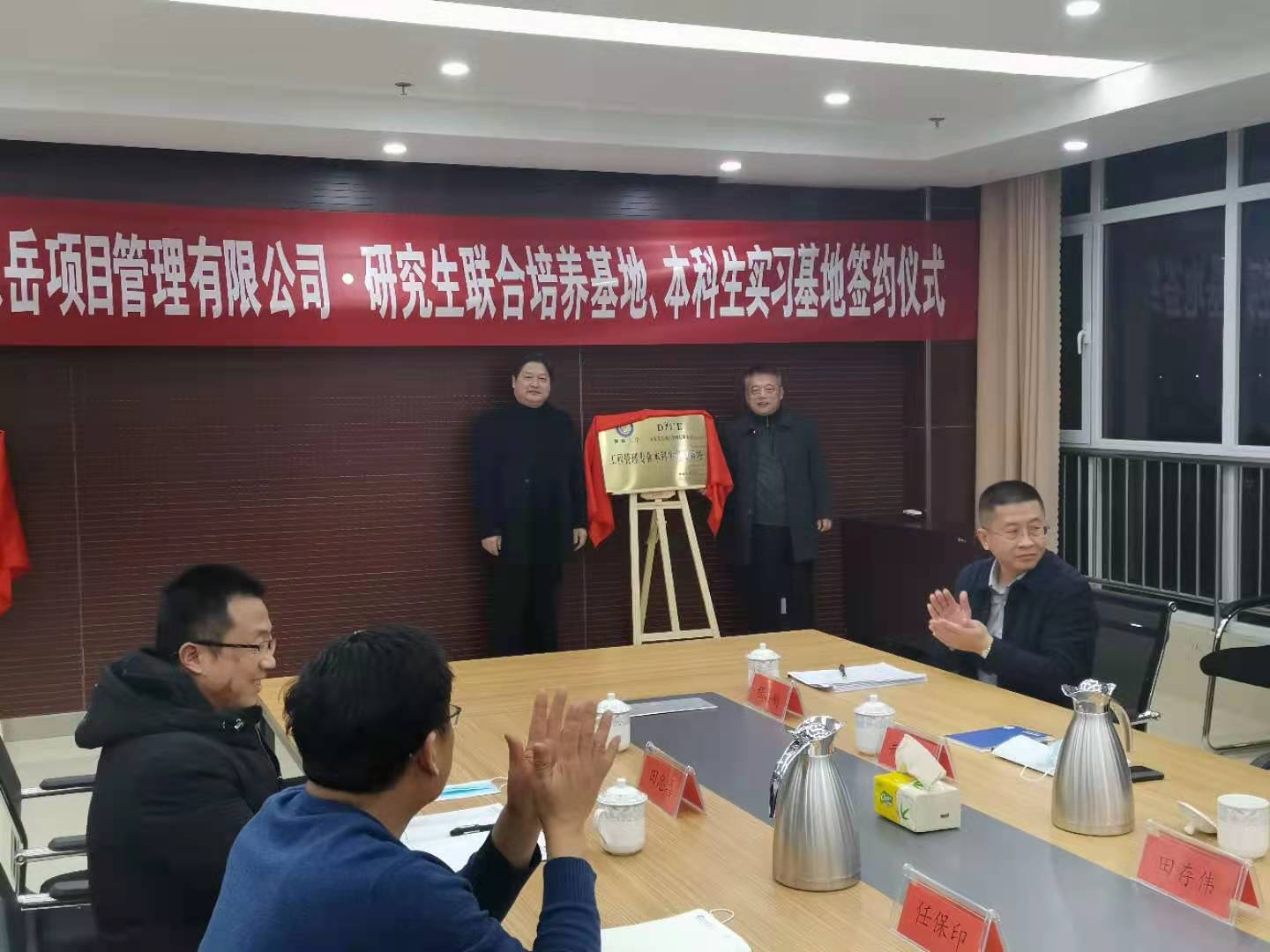 2021年1月8日下午,91天堂 与山东东岳项目管理有限公司在东岳大厦第三会议室举行校企战略合作会议。学院党总支书记朱明英、副书记兼副院长任保印、副院长孟昭博、张绪涛以及工程管理系主任汤美安、土木工程系主任田忠喜、科研秘书张保良一行,到山东东岳项目管理有限公司,出席研究生联合培养基地及产学研合作签字和揭牌仪式。