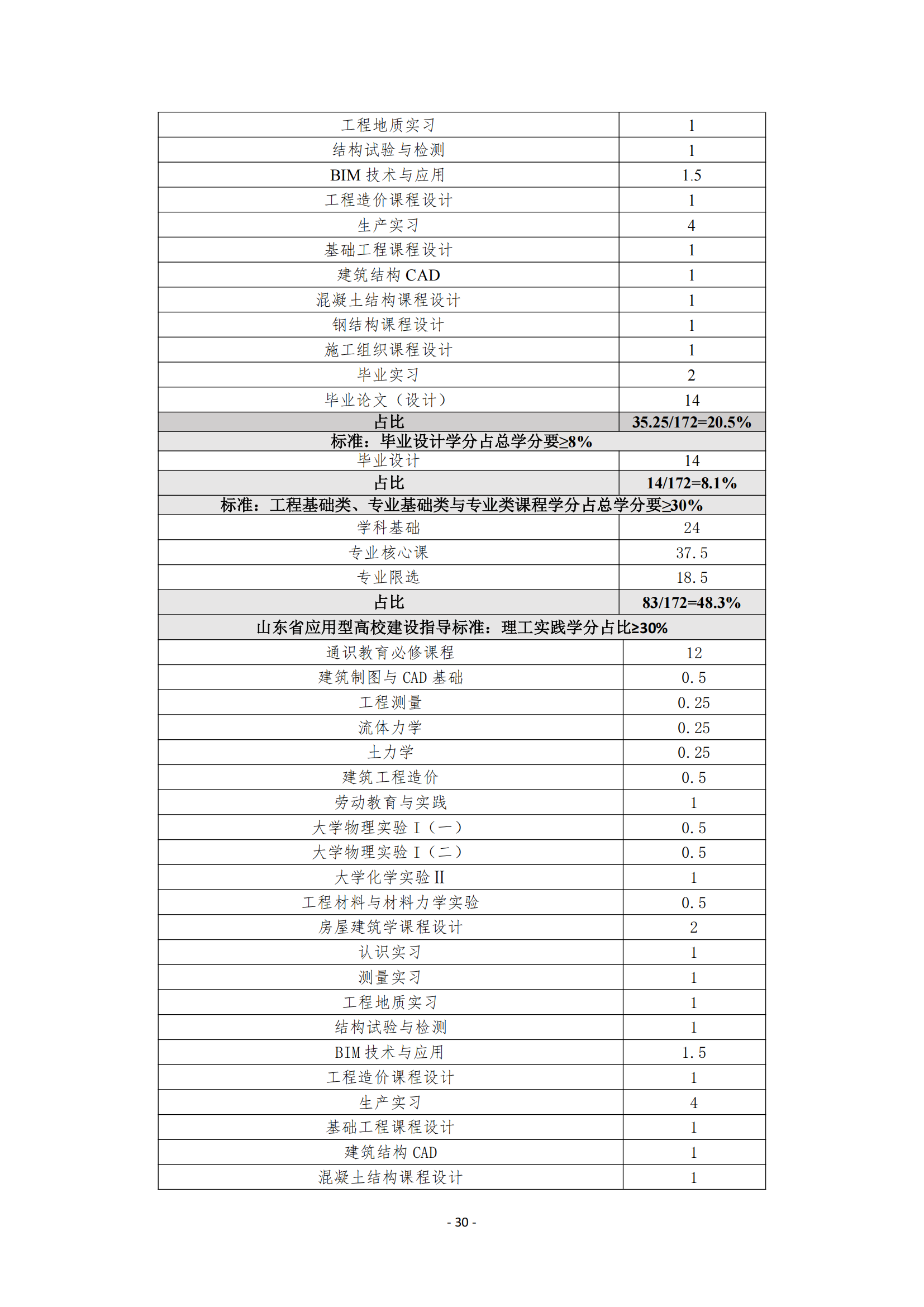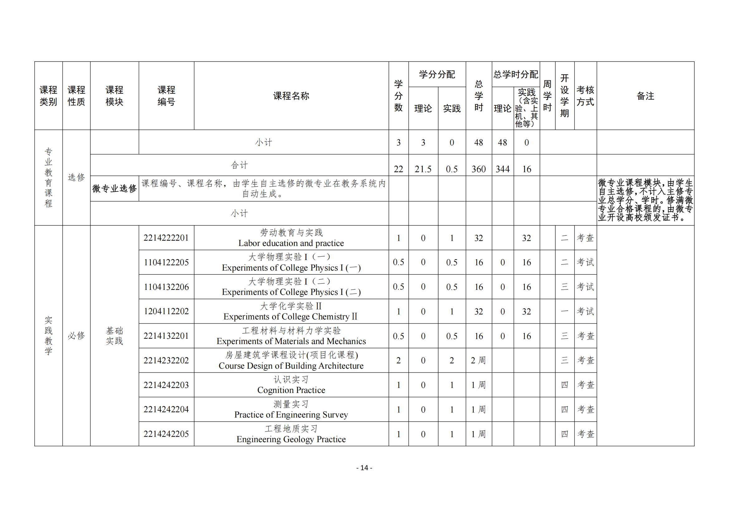 大学物理实验、大学化学实验、工程材料与材料力学实验、结构试验与检测、房屋建筑学课程设计、基础工程课程设计、混凝土结构课程设计、钢结构课程设计、施工组织课程设计、单层工业厂房设计、工程造价课程设计、认识实习、测量实习、工程地质实习、建筑结构 CAD、生产实习、毕业实习、毕业设计等。
