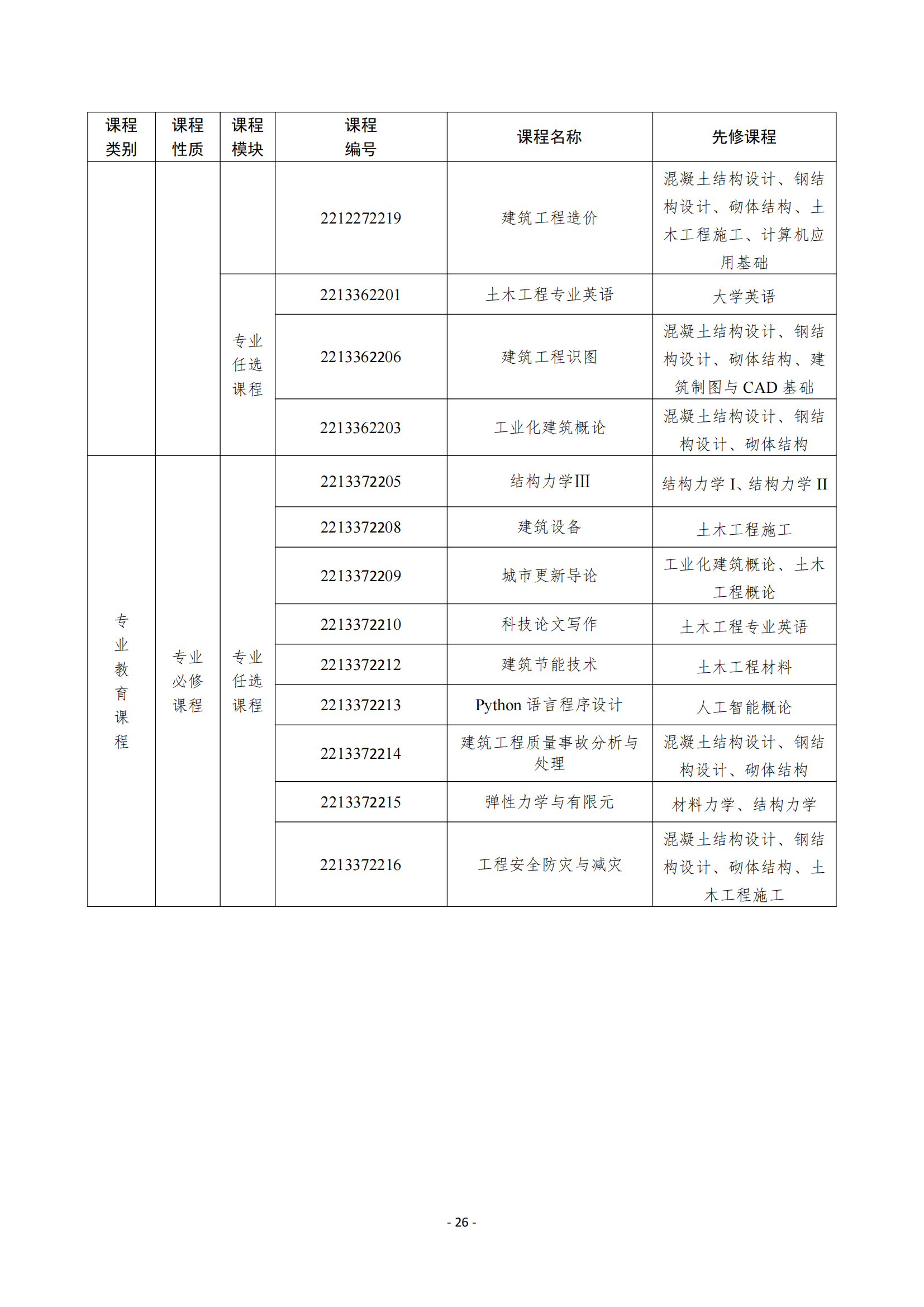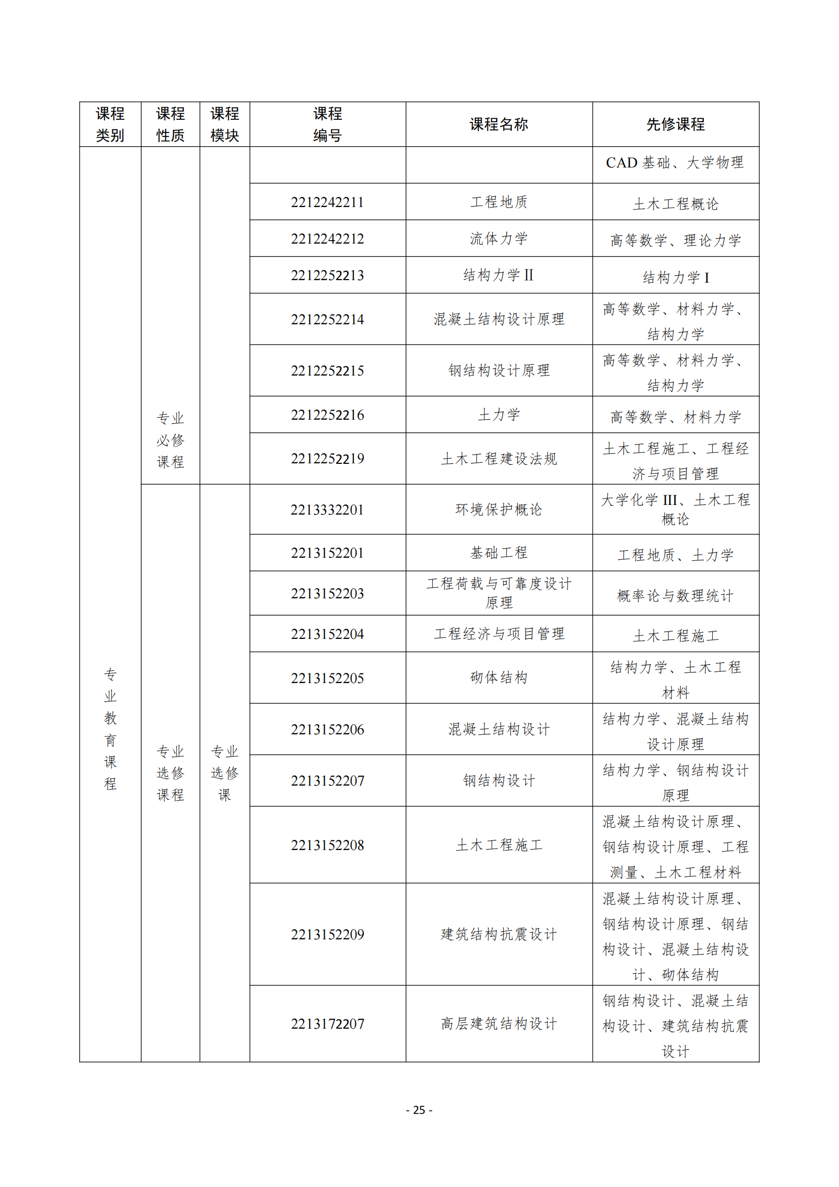 主要课程:高等数学、线性代数、概率论与数理统计、土木工程概论、画法几何、建筑制图与 CAD 基础、房屋建筑学、理论力学、材料力学、结构力学、土力学、基础工程、工程测量、土木工程材料、混凝土结构设计原理、钢结构设计原理、建筑结构抗震设计、土木工程施工等。
